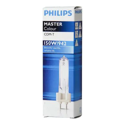 Le Philips CDM-T 150W 942 G12 (MASTERColour) sono lampade a scarica compatte da 150W con base G12. Queste lampade a scarica presentano una vita media di 12.000 ore e sono caratterizzate da un'elevata efficienza energetica. La resa dei colori é eccellente grazie all'indice di resa cromatica di 90-100Ra. Sono inoltre dotate di un filtro UV che limita lo scolorimento degli oggetti illuminati. Un'altra proprietà da sottolineare é l'intensità del flusso luminoso: ben 12700 lumen.